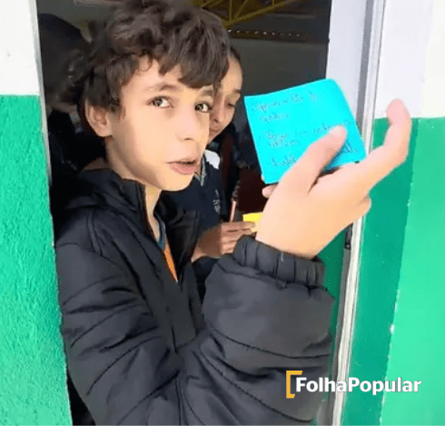 Aluno faz a leitura da carta escrita coletivamente exigindo autoridades para trazer ao cardápio, uma merenda mais diversa e relacionada aos costumes locais