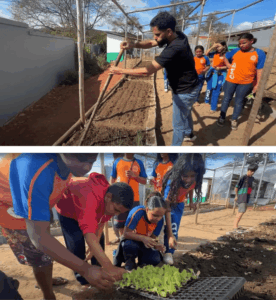 O diretor João Martins e alunos com a mão na massa realizando os plantios da hora comunitária